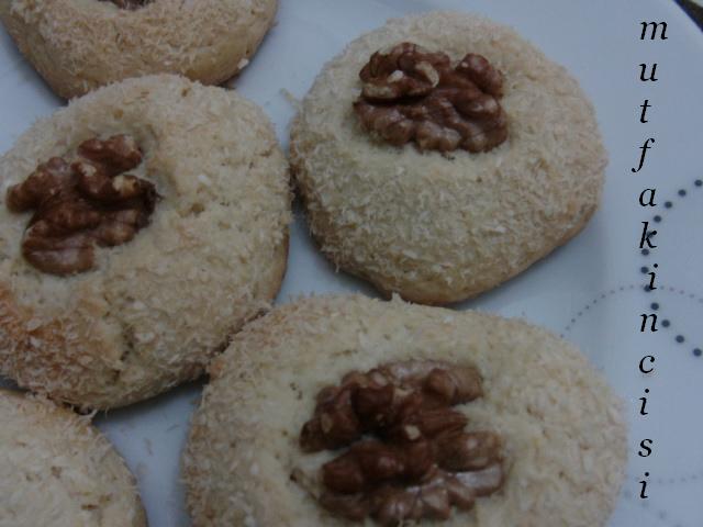 Elinize ceviz kadar büyüklüğünde hamurdan beze alın yuvarlayın ayırdığınız yumurta akına sonra hindistan cevizine bulayın tepsiye dizin üzerlerine yarım ceviz koyun bastırın. Fırında hafif pembeleşinceye kadar pişirin Afiyet şifa olsun
